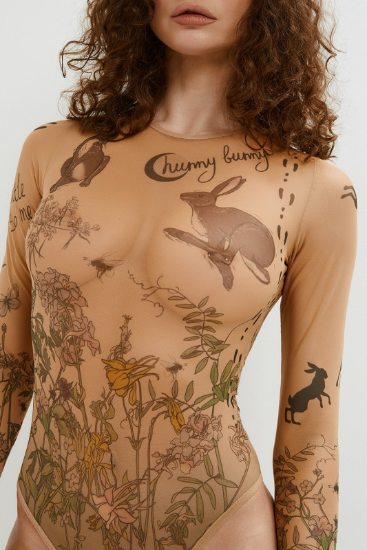 Итальянская микросетка бежевого цвета с фантазийным рисунком выглядит на теле как татуировка, что придает образу индивидуальность и выглядит максимально роскошно и необычно!