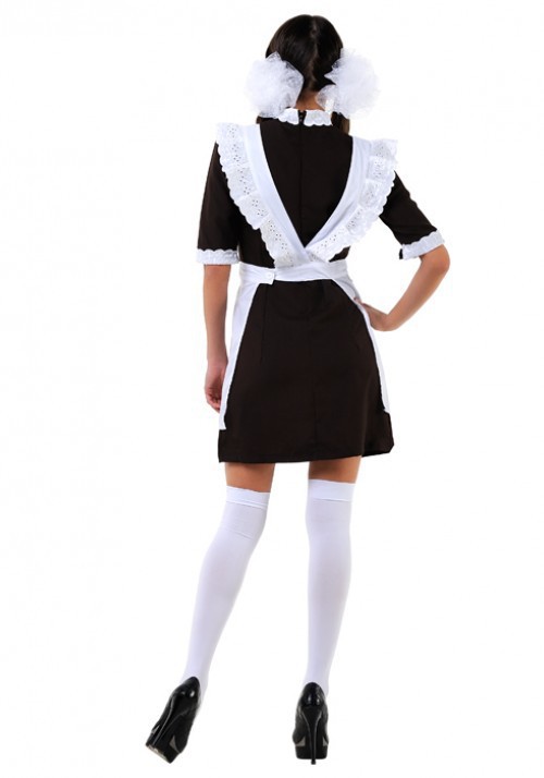 Комплект состоит из классического коричневого платья с белым воротничком и белоснежного фартука!