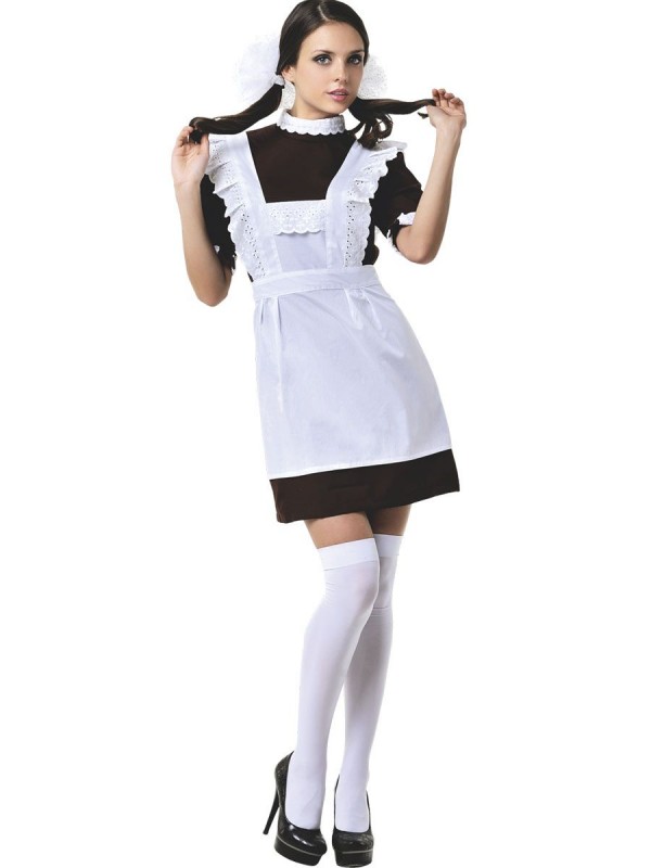 Комплект состоит из классического коричневого платья с белым воротничком и белоснежного фартука!