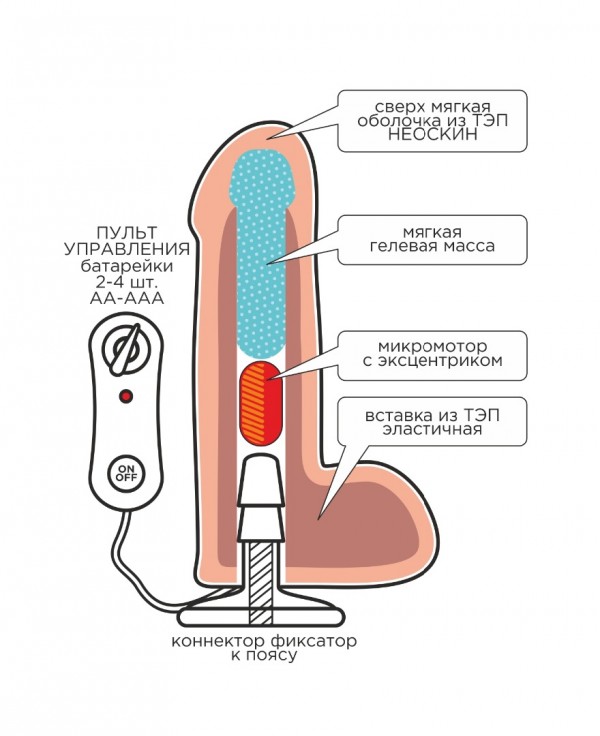 Внешняя реалистичная насадка с вибрацией. Выполнена из двухкомпонентного материала неоскин, где внутренний слой более твердый, а внешний - мягкий и бархатистый, что в целом гарантирует максимальную реалистичность!